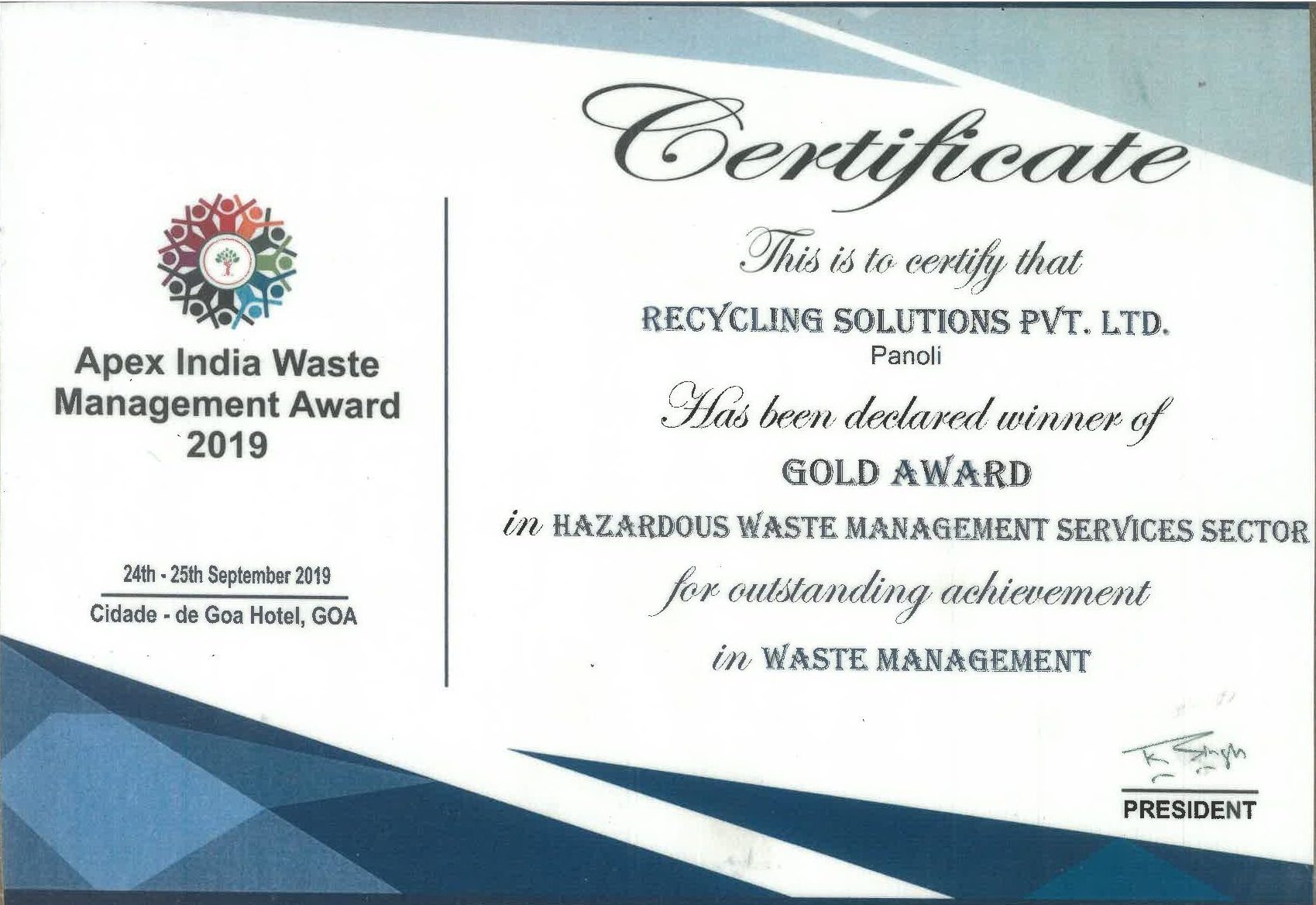APEX India Waste Management Gold Award